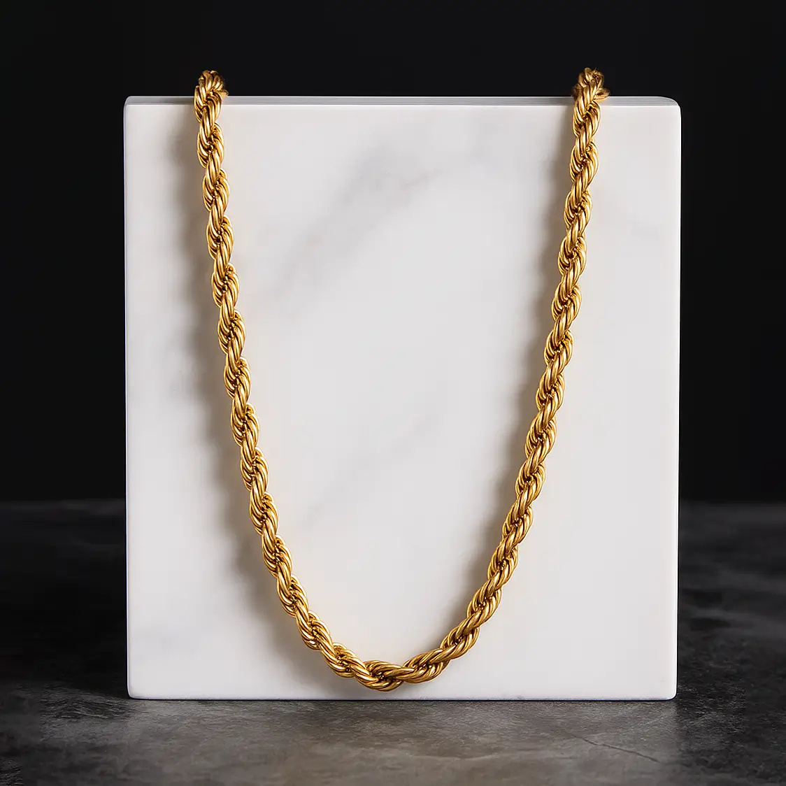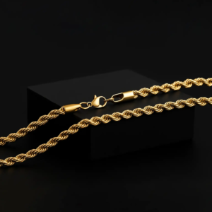 Gold plated rope chain with a polished twisted-link finish that catches the light. Made from high-quality metal with an anti-tarnish coating and a waterproof finish, this chain stays bright through daily wear. Lightweight and comfortable, it has a secure clasp for easy on and off and works great worn alone or layered with other necklaces.