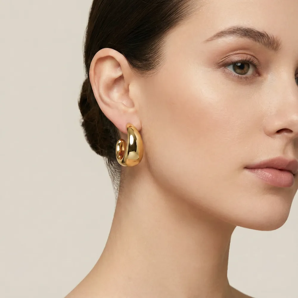 These hoops have a dome-style shape that gives them a fuller and more sculpted look compared to regular thin hoops. The curved surface reflects light in a soft way, which makes the earrings look rich and polished. Their golden colour adds a touch of sophistication, making them wearable with almost any shade or outfit.