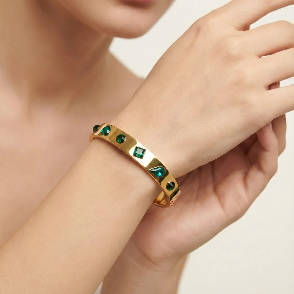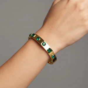 The bracelet features a series of emerald-green stones arranged evenly across the band. These stones stand out beautifully against the golden base, giving the bracelet a stylish contrast. Each stone is shaped and set carefully to catch light from various angles. The mix of round and square stones adds variety and gives the bracelet a more detailed look. Instead of being overly flashy, the stones bring a steady shine that works well for daily wear as well as party outfits.