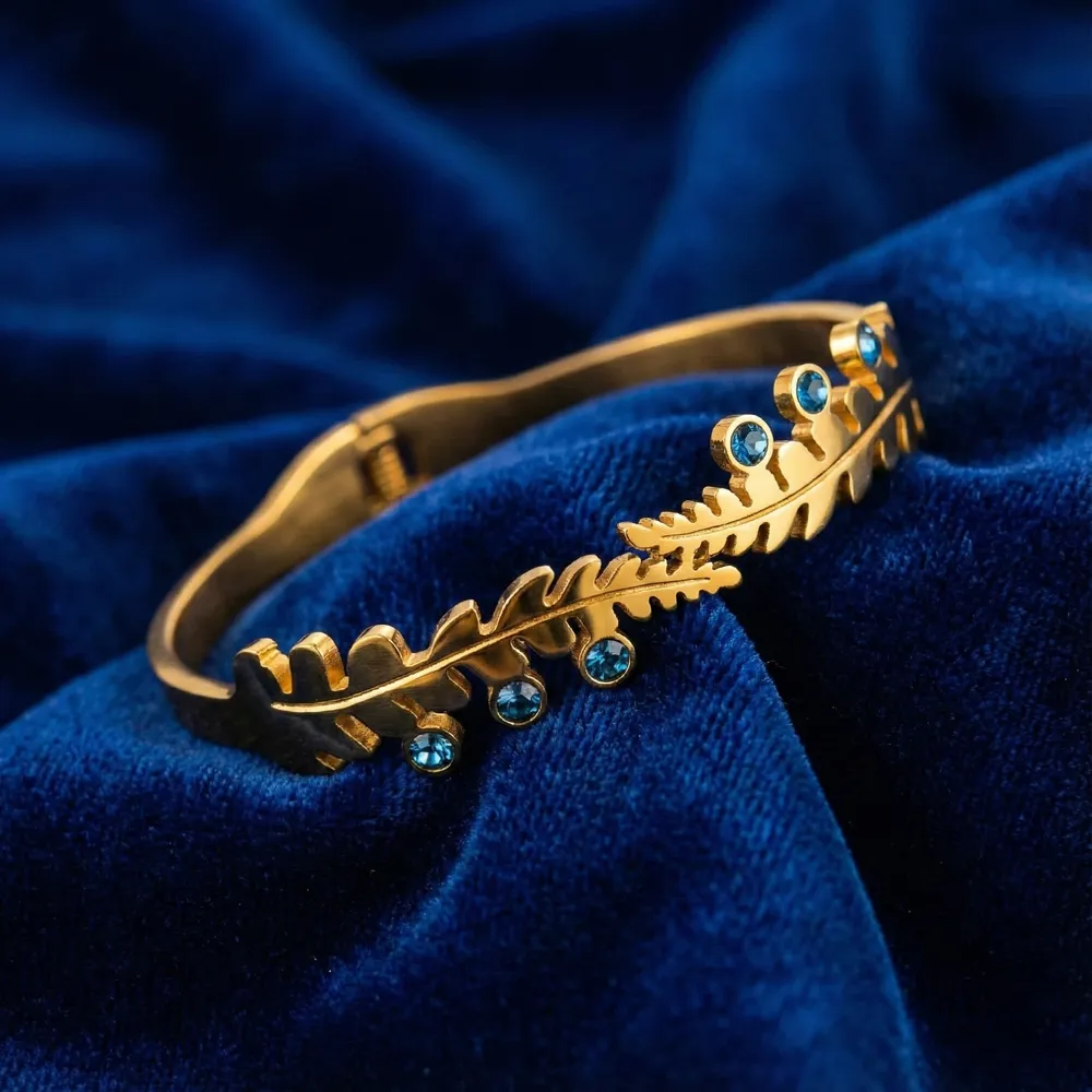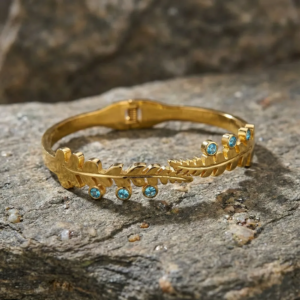 The bracelet takes its form from gently curved leaves found in nature. Each leaf detail is shaped to catch light softly, creating a warm golden glow when worn. The aqua stones at the tips add a bright touch that feels lively without being too bold. This balance of gold and aqua makes the piece stand out while still staying subtle enough for everyday styling.